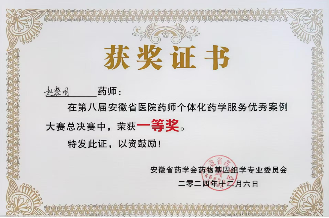 近日,在第八届安徽省医院药师个体化药学服务优秀案例大赛中,麻豆性爱 赵黎明药师从全省近300 名参赛药师中脱颖而出,荣获一等奖。