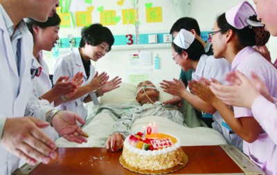 多分钟过后,医护人员们手捧鲜花和蛋糕走了进来为老人祝寿,祝老人早日康复。随着《生日歌》的响起,大家为老人点燃了生日蜡烛,将医护人员最诚挚的祝福送给了这位百岁老人。