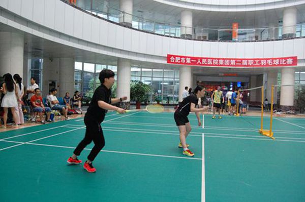 早上八点不到,工会工作人员及各分会工委便早早到了滨湖医院阳光大厅,刚整理好运动地板,摆好了网架,早到的运动员们便跃跃欲试的在场地上练习了起来。戴院长作为院部分会的领队也早早来到赛场,亲自挥舞球拍,帮运动员们加油打气。为了记录下这生机勃勃的场面,全体运动员及工作人员们拍了张大合照后,比赛便正式拉开序幕。这次进行的比赛是团体赛,以分会为单位,共八个分会。规则同样实行循环赛制,每场比赛打满五局,即五场(男单、女单、男双、女双、混双)三胜制。赛场上运动员们个个挥汗如雨,健步如飞,每组队员配合默契,齐心协力,戴院长更是在一旁为运动员加油鼓气,使得大家兴致极高!出色的比赛引来了众多人员的观看,精彩的球技赢得大家的阵阵掌声!下午,合肥电视台的工作人员还来到了阳光大厅进行了采访和拍摄,整个场面朝气蓬勃,选手们使出浑身解数,时而奋力扣杀,时而轻盈吊球,每道招式尽是精彩,真正赛出了风格,赛出了水平!