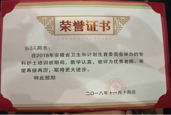 随着肿瘤护理学科的不断发展,肿瘤的化学治疗、放射治疗和手术治疗等领域新药物、新技术的不断应用,对肿瘤科护士提出了新的挑战,肿瘤专科护士的培养越来越受到护理研究者和管理者的重视。合肥市滨湖医院血液肿瘤科,作为安徽省肿瘤专科护士培训基地,在2018年第六届安徽省肿瘤专科护士培训中,带教老师耿春花被安徽省卫生和计划生育委员会医政医管处授予“优秀老师”荣誉称号。