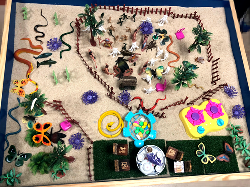 (图为第一次心理成长训练营,孩子们搭建的沙盘图)