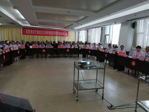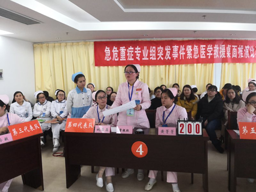 赛当天由急诊科洪艳护士长助理担任主持人,潘爱红、何蕾、龚存华、陈霞四位主任担任评委。比赛分为共答和抢答两个环节,来自全集团8组选手都发挥出了自己的水平,语言流畅,表达清晰,在规定时间内能准确表达自己的观点,遵循循证,体现团队协作。抢答环节更是扣人心悬,每队选手积极应变和抢答,展现出熟练的专业知识。同时全集团急危重症专业组60多护士前来观摩比赛。