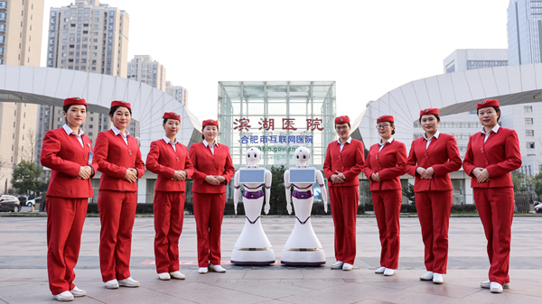 智慧医疗助力健康生活,滨湖医院导医队和导诊机器人“晓曼”祝大家新年快乐!