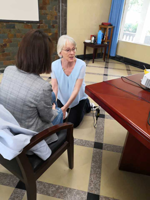 随后Rubach教授来到了会议室举行了座谈会,就我们在日常护理工作中存在的难以解决的问题一一进行了解答。Rubach教授讲授的方式十分的生动有趣,专业知识与自身经历相结合,还增加了现场模拟教学,大家两两组队,作为护理人员的同时也扮演老人的角色,通过亲身感受来对护理效果进行评价。对于不明白的地方Rubach教授更是不断讲解亲身示范,同时肯定了科室的一些护理模式。大家积极发言,现场气氛活跃,掌声不断。