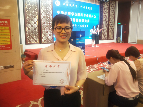 眼科护士芮燕凭借精心的选题、生动的语言、自然的台风和稳健的发挥,荣获全国眼科护理科普演讲大赛三等奖。