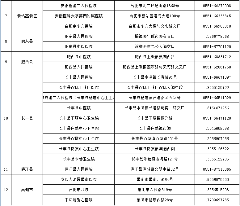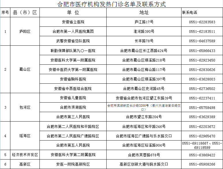 合肥市新型冠状病毒感染的肺炎医疗机构发热门诊名单及联系方式