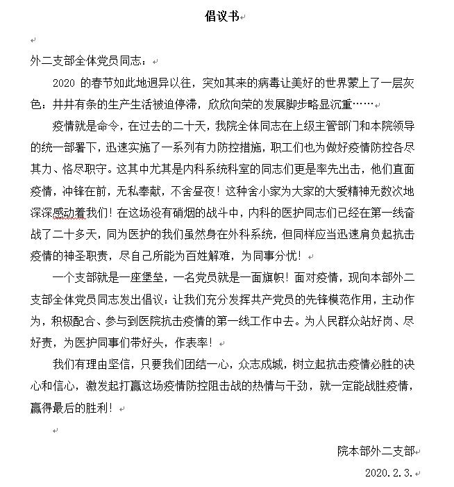 日,外二支部率先向全体党员发出倡议:让我们充分发挥共产党员的先锋模范作用,主动作为,积极配合、参与到医院抗击疫情的第一线工作中去,为人民群众站好岗、尽好责,为医护同事们带好头,作表率!我们相信,只要我们团结一心,众志成城,充分运用我们的专业知识和精湛的技术,就一定能够打赢这场疫情防控阻击战!