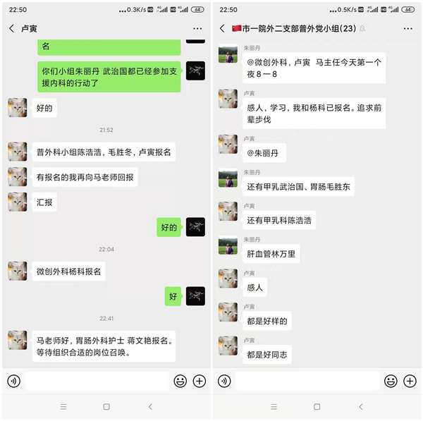 倡议发出后,外二支部各党小组讨论热烈,同志们都在通过各种渠道踊跃报名。外二支部目前已派出多名同志战斗在抗击疫情的最前线。