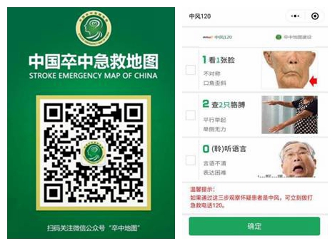 关注微信公众号,让公众早期识别卒中症状,及时拨打120,利用黄金急救圈选择国家认证的卒中中心(医院),优化到院路径,减少发病到呼救时间延误。