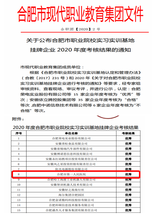 作为合肥市现代职业教育集团职业院校实习实训基地挂牌企业,护理部作为牵头部门,根据《合肥市职业院校实习实训基地挂牌企业考核表》的指标体系,认真组织准备考核佐证资料上报至合肥市现代职业教育集团,并参加现场答辩,顺利通过2020年合肥市现代职业教育集团挂牌企业考核,获得考核“优秀”,并获得市财政30万项目建设资金。