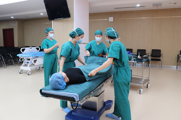2020版《手术室护理实践指南》为评分标准,选手四人搭档一组,比赛内容为四种基础体位的摆放,分别是仰卧位、俯卧位、侧卧位和截石位,限定比赛时间,每个体位安置时间不超过8分钟