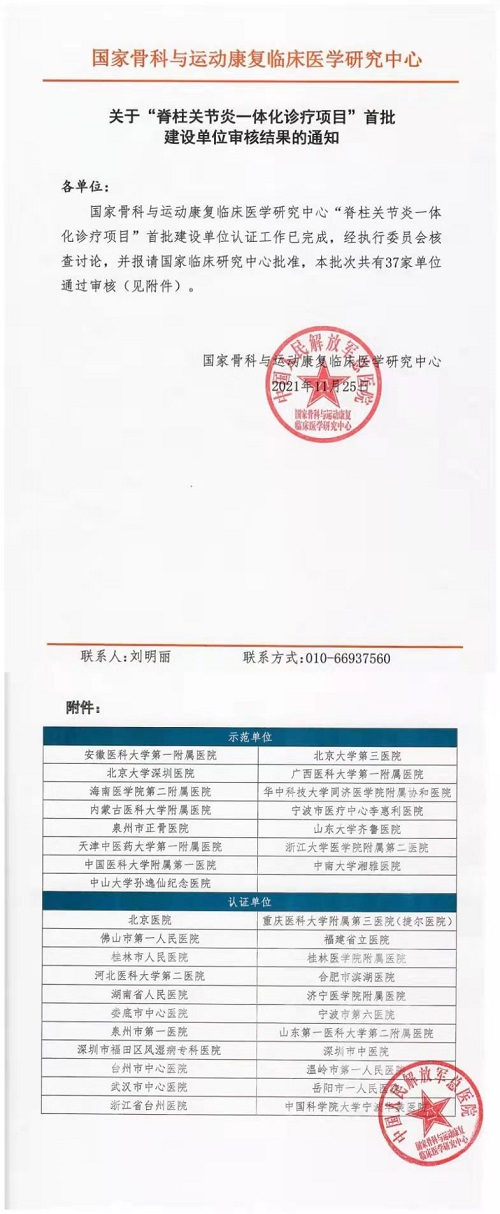 “华佗工程——脊柱关节炎一体化诊疗项目”是由中国医疗保健国际交流促进会风湿免疫病学分会发起,国家骨科与运动康复临床医学研究中心提供学术支持,北京协和医院及中国人民解放军总医院牵头的学科建设项目。该项目于今年4月启动,截止目前,共有245家医院风湿免疫专科注册申请该项目认证,经执委会评审决定,本批次共产生示范单位15家,认证单位22家。