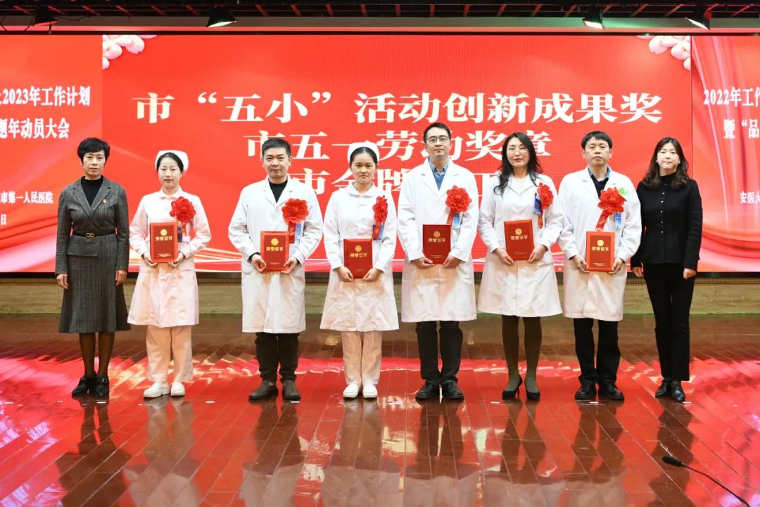 副院长汪庆童、工会主席李春林为五小五一金牌获奖代表颁奖
