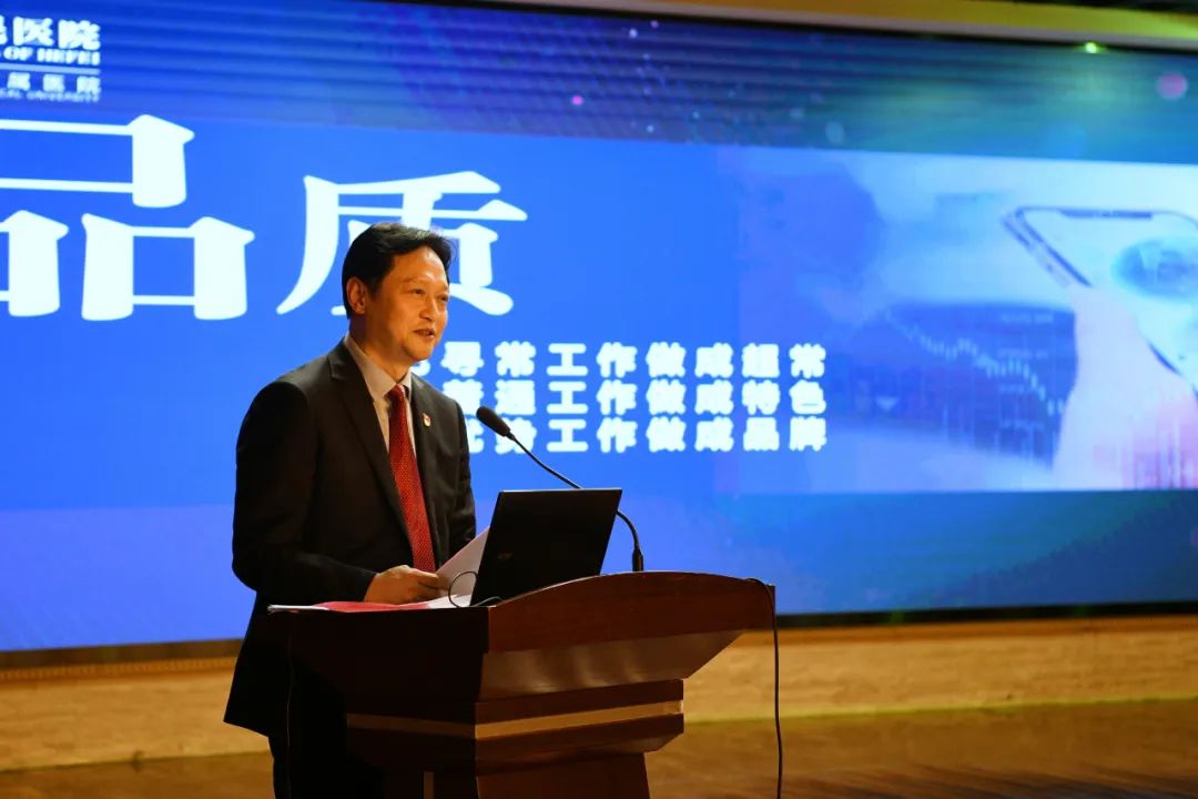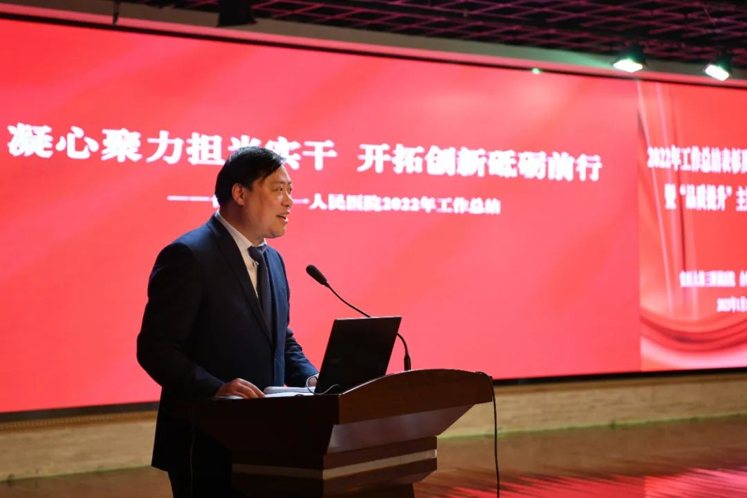 唐智国院长从医疗业务工作、党建工作、疫情防控工作、学科建设、科研教学人才工作、运营管理、文化建设、行风作风廉政建设八个方面全面回顾了2022年全年工作。提出2023年的工作目标是学科建设切实加强,力争 15个学科进入合肥市第七周期重点专科建设序列,3至5项新技术新项目达到省内先进;科技创新不断提升,国自然项目力争突破、省级项目立项2项;内部管理深层优化,通过三级医院2022年版标准复审;智慧建设向上提级,通过电子病历五级、互联互通四甲评审;国考排名达到A级,出院患者手术占比达到38%,四级手术占比达到20%,微创手术占比提高5%,平均住院日7.5天以内,CMI值、满意度有效提高,进入全省地市级医院第一方阵;业务指标稳步增长,门诊人次提高5%、出院人次提高7-8%。
