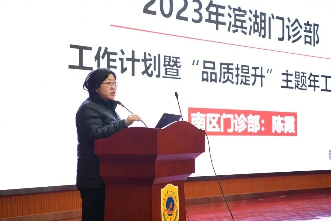 滨湖门诊部主任 陈霞:2023年,滨湖院区门诊部将以开展“品质提升年”为载体,推动管理理念创新和服务品质升级,紧紧围绕全年工作计划及《公立医院高质量发展》等文件要求,踔厉奋发谱新篇、奋楫笃行向未来,努力做到让人民群众便捷就医、安全就医、有效就医、明白就医,促进门诊医疗服务和管理能力的再提升。