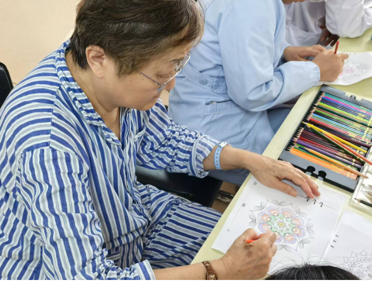 活动于10月11日下午2:30在甲乳外科病房正式拉开帷幕,活动开始,主持人张丽护士长介绍了活动的目的、流程和注意事项,耿春花护士长和董惠玲老师为现场的患者和家属简要介绍了曼陀罗绘画和催眠的背景和益处。通过专业人员的讲解,患者们对这两种心理疗愈方式有了一些了解,也更加期待接下来的活动环节。随后,患者们在老师指导下开始了曼陀罗绘画创作。他们纷纷拿起画笔,选择自己喜欢的曼陀罗图案自由发挥,沉浸在艺术创作的美妙世界中。轻柔的音乐在空气中流淌,营造出了轻松、舒适的氛围。在绘画的过程中,患者们不仅享受到了创作的乐趣,更通过画笔表达了自己的情感和想法,释放了内心的压力和困扰。