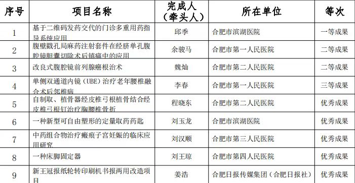 12月19日,合肥市职工“五小”活动创新成果评选结果公布,麻豆性爱 药学部邱季的《基于二维码发药交代的门诊多重用药指导系统应用》项目获一等成果奖,麻醉科余骏马的《腹壁戳孔局麻药注射套件在经脐单孔腹腔镜胆囊切除术后镇痛中的应用》项目获二等成果奖,脊柱骨科李春的《单侧双通道内镜(UBE)治疗老年腰椎融合术后邻椎病》项目获三等成果奖,药学部刘玉龙的《一种新型可自由塑形的定量取药药匙》项目获优秀成果奖。2...