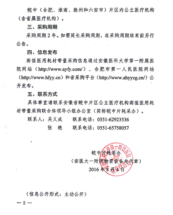 关于启动安徽省皖中片区公立医疗机构高值医用耗材带量采购工作的公告