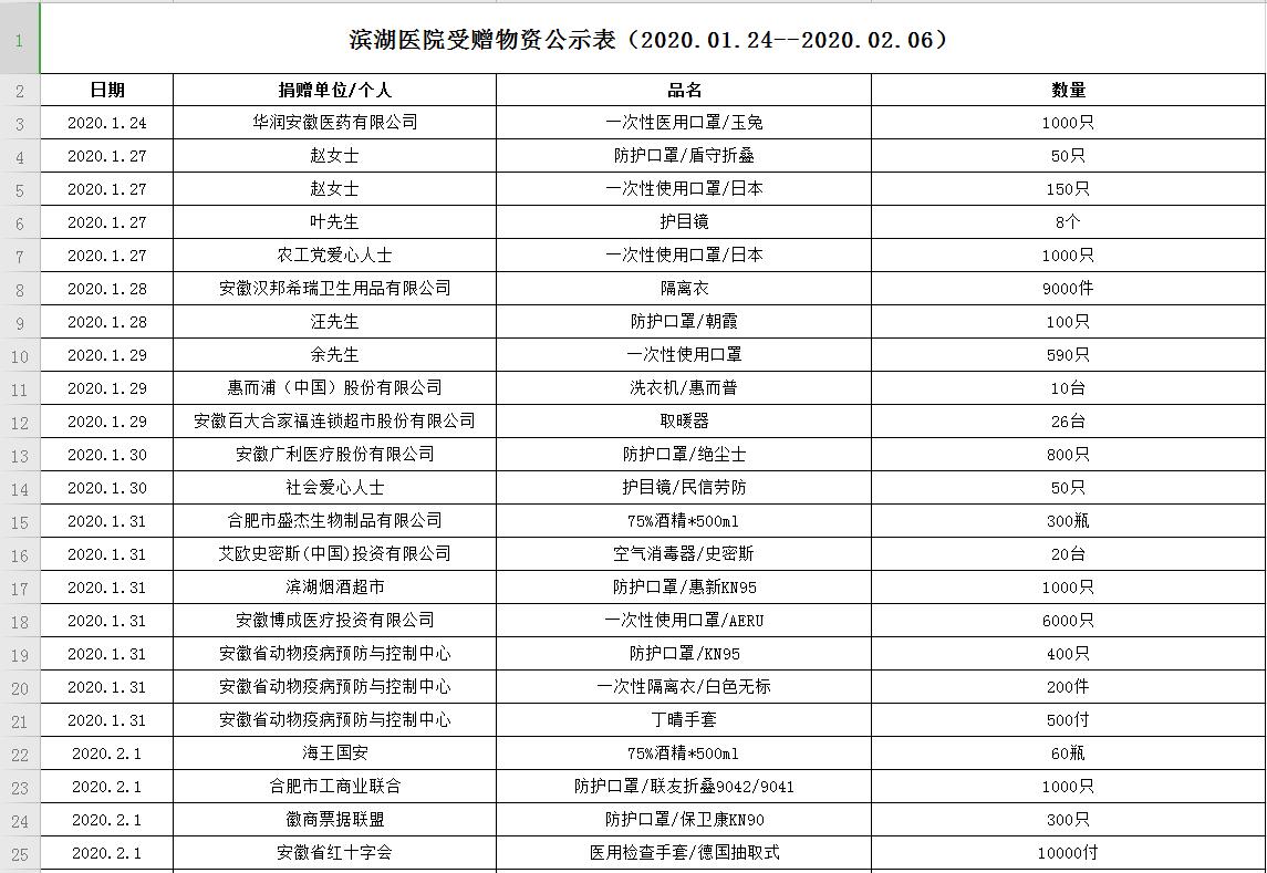 滨湖医院受赠物资和捐款公示表(2020.01.24--2020.02.06)