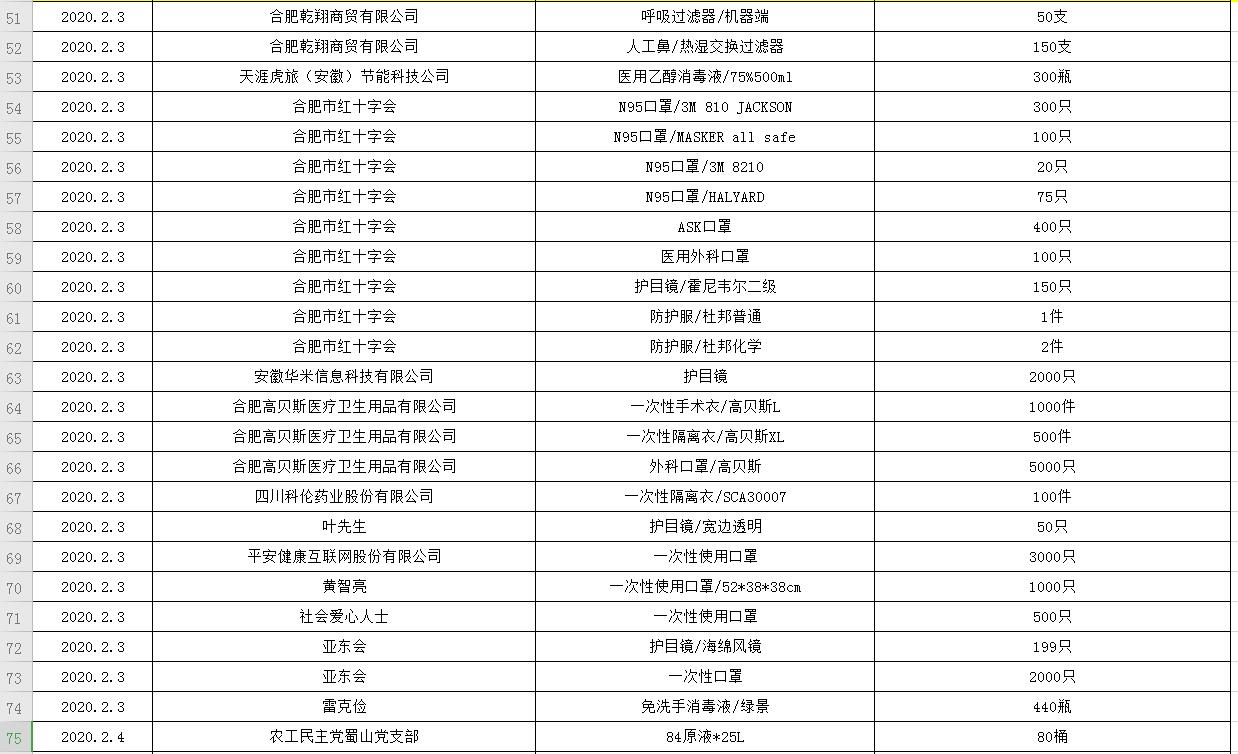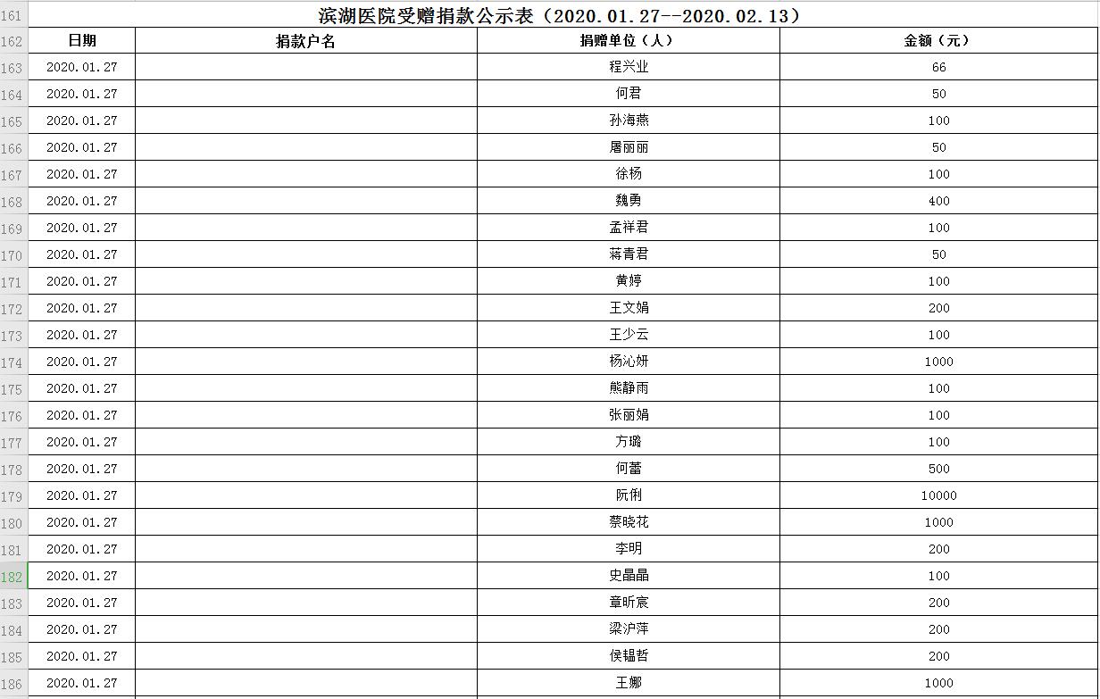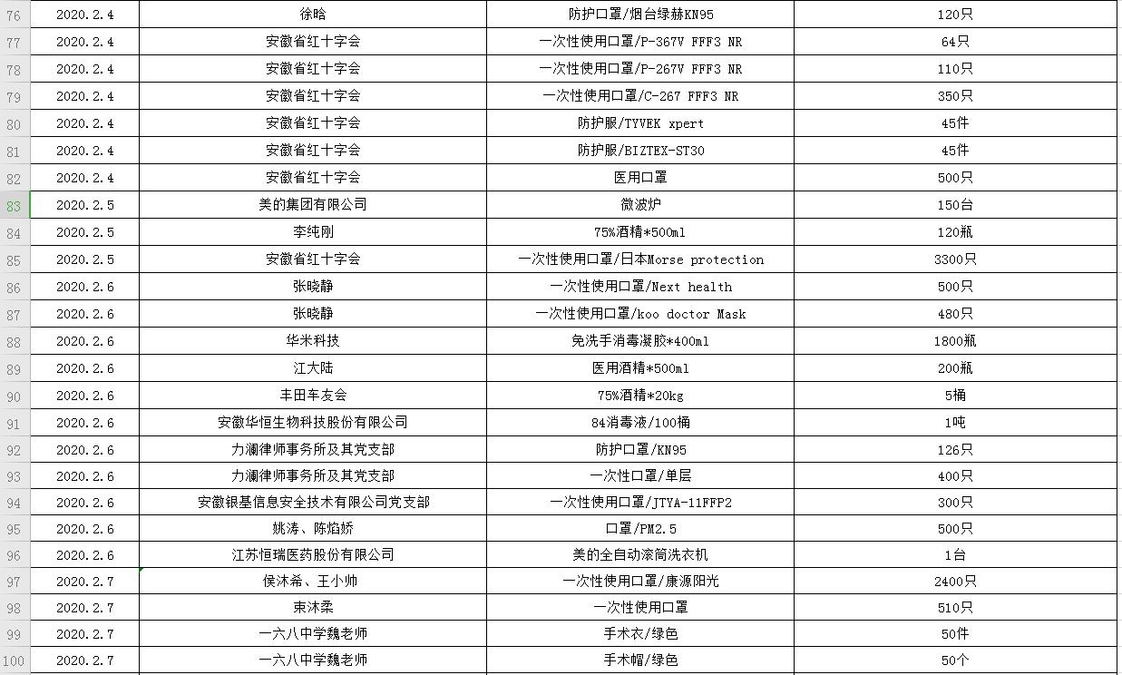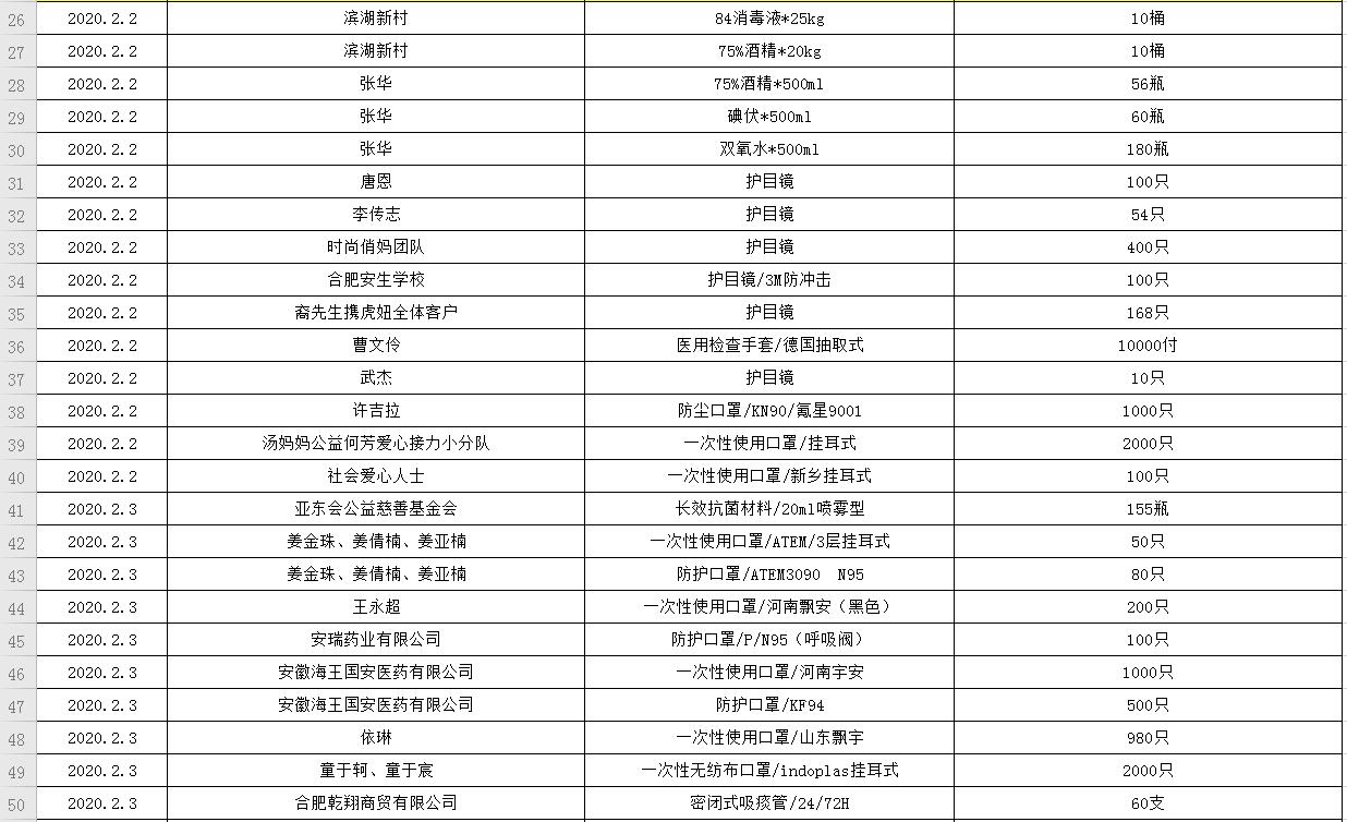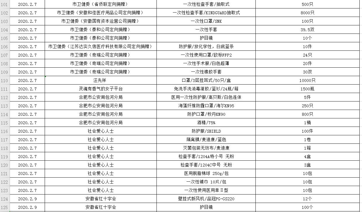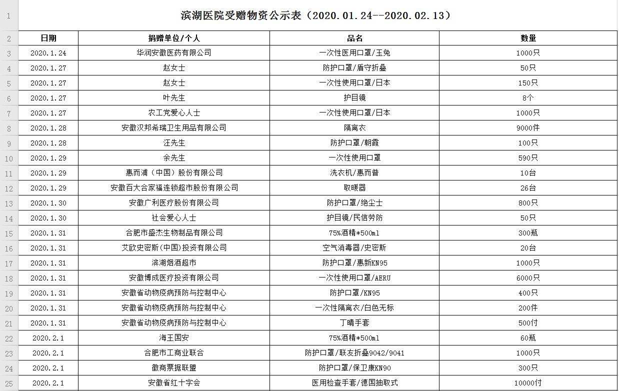 滨湖医院受赠物资公示表(2020.01.24--2020.02.13)
