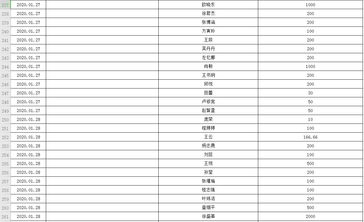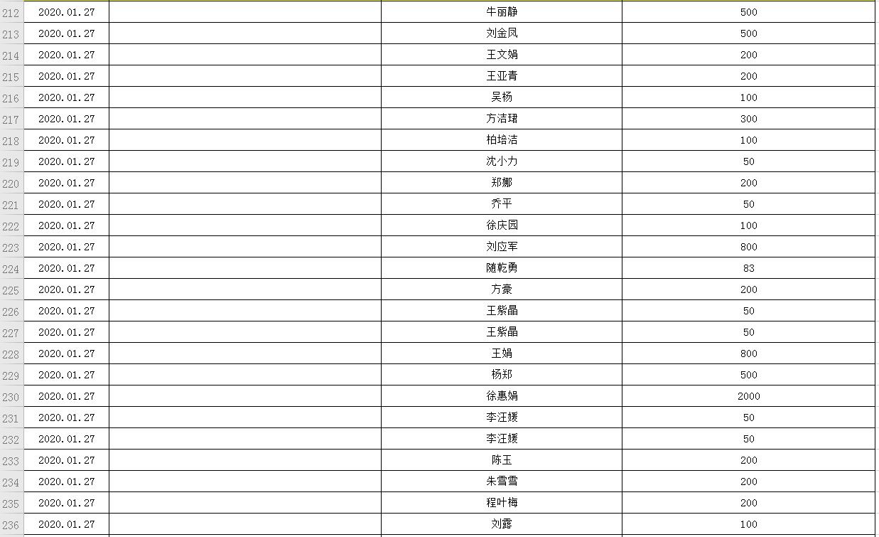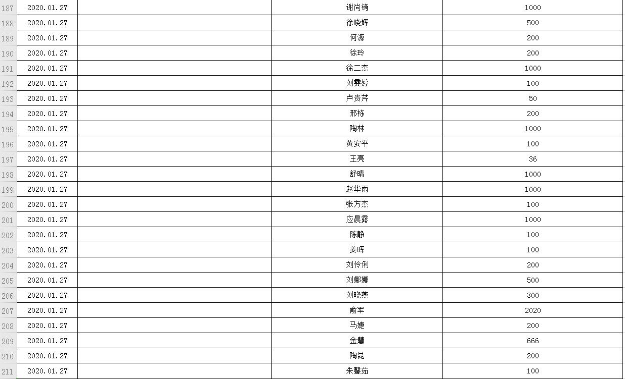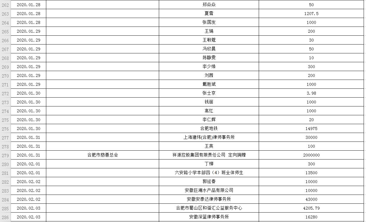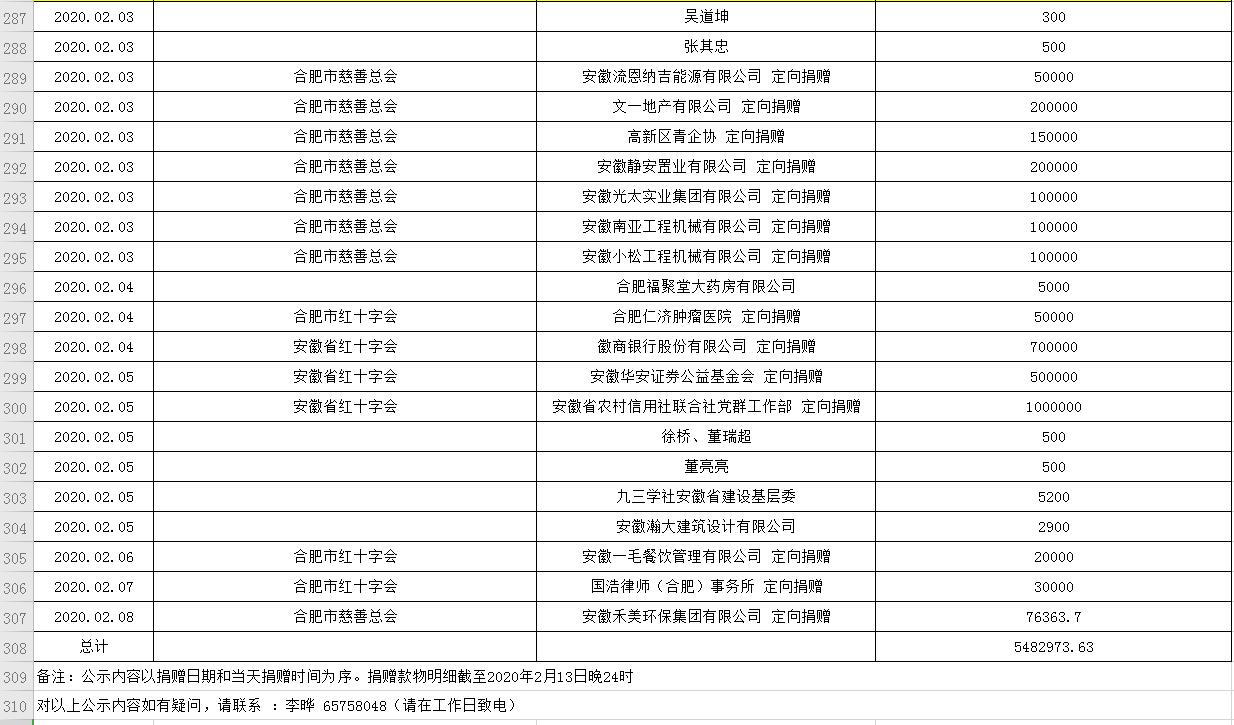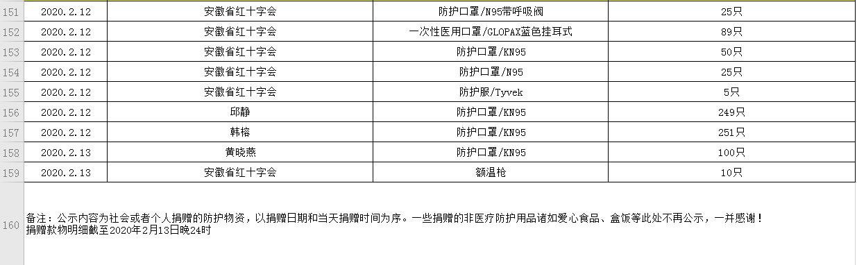 滨湖医院受赠物资公示表(2020.01.24--2020.02.13)
