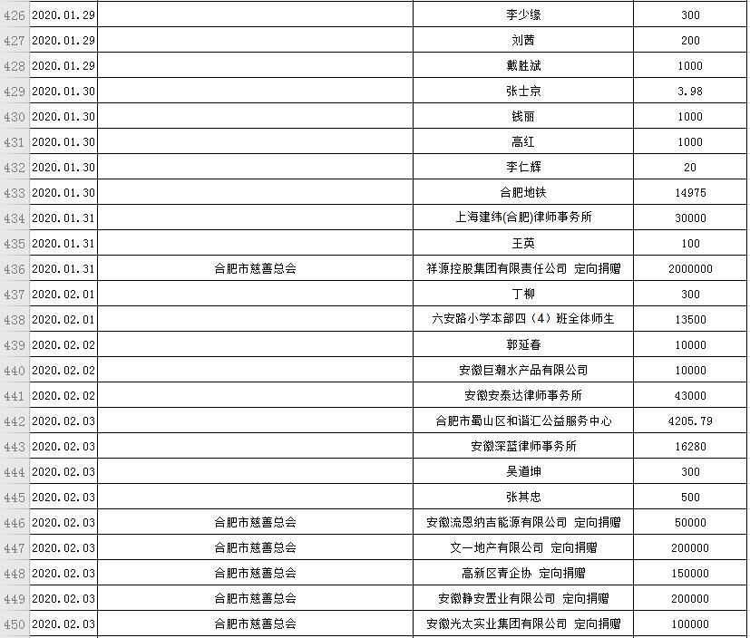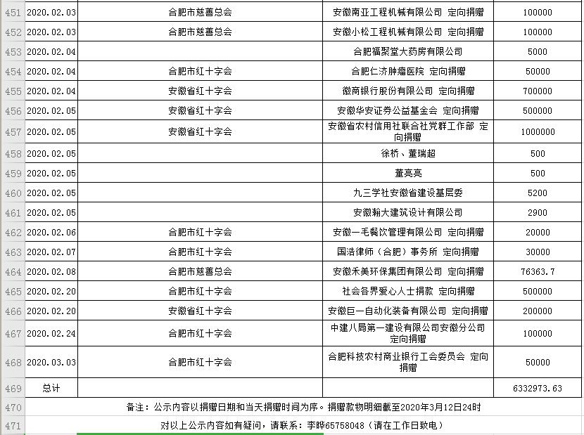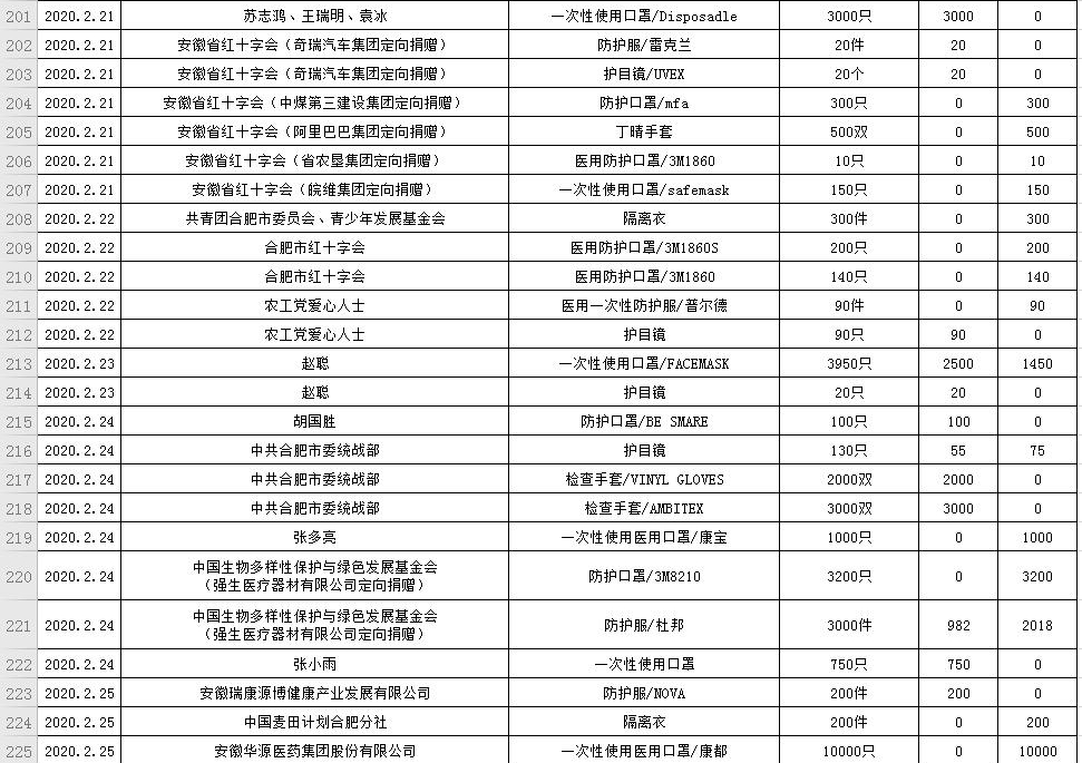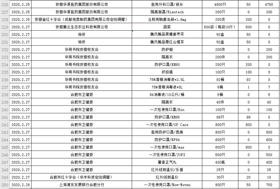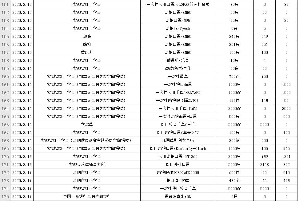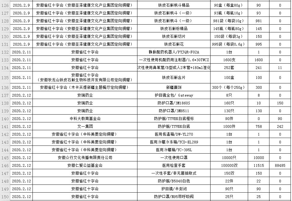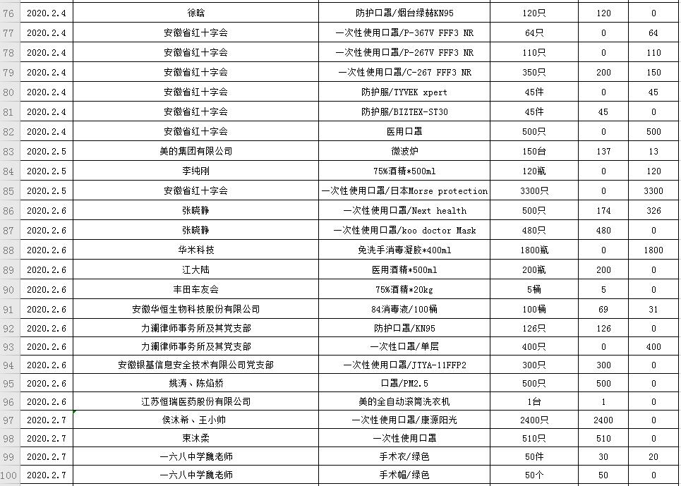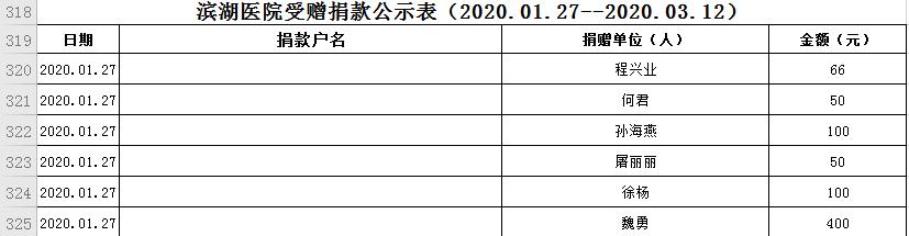 滨湖医院受赠物资公示表(2020.01.24--2020.03.12)