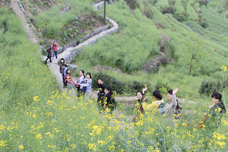 美丽的灵山是我们此行的第二站,它是皖南古村落的典型代表之一,以山岭的油菜花为主。虽然已过盛花期,但仍有晚期开放的黄花点缀在依坡层层而上的绿叶之中。在夕阳的映照下,反射出点点金光,非常好看……。拍照、留影、合影,大家都想尽情的把自己固话在这美景之中。