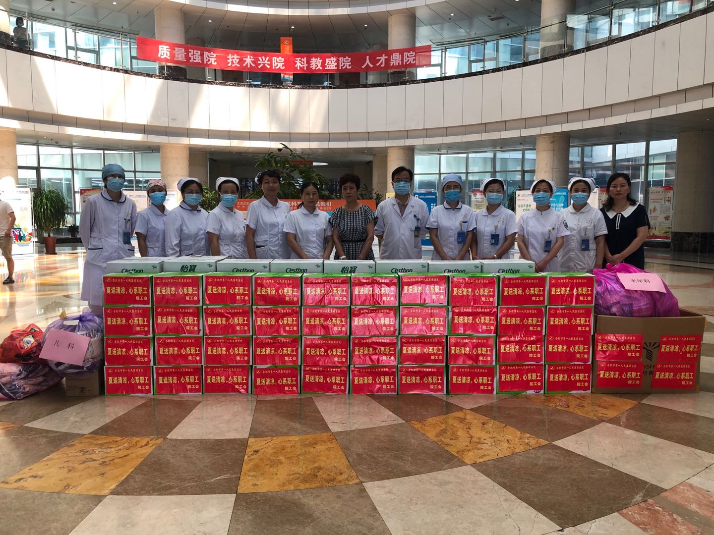 2020年8月14日、8月17日院工会分别在本部院区急诊大厅和滨湖院区阳光大厅发放毛巾、香皂、绿茶、矿泉水等防暑降温用品慰问临床一线加床繁忙的科室职工。工会主席李春林亲切问候职工们的工作情况,希望他们在坚守岗位的同时要注意防暑,劳逸结合,确保健康和安全,并对职工为医院发展付出的辛勤劳动表示感谢。