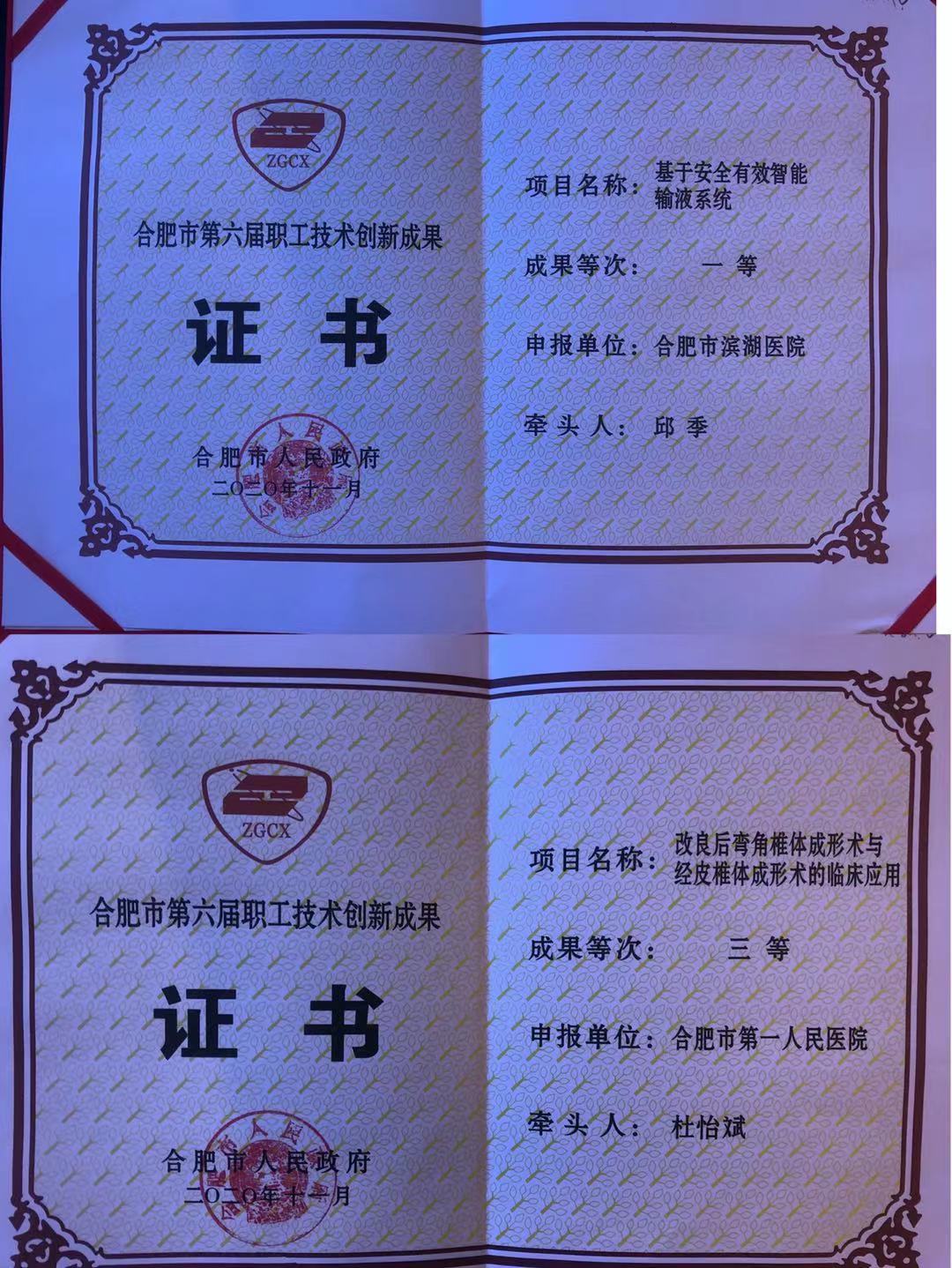 近日,合肥市第六届职工技术创新成果评选结果出炉,经过市总工会组织各行专家对申报项目进行认真论证和讨论,根据创新成果所创造的经济价值和社会环境效益,评选出药学部邱季申报的《基于安全有效智能输液系统》荣获一等成果、脊柱骨科杜怡斌申报的《改良后弯角椎体成形术与经皮椎体成形术的临床应用》荣获三等成果。